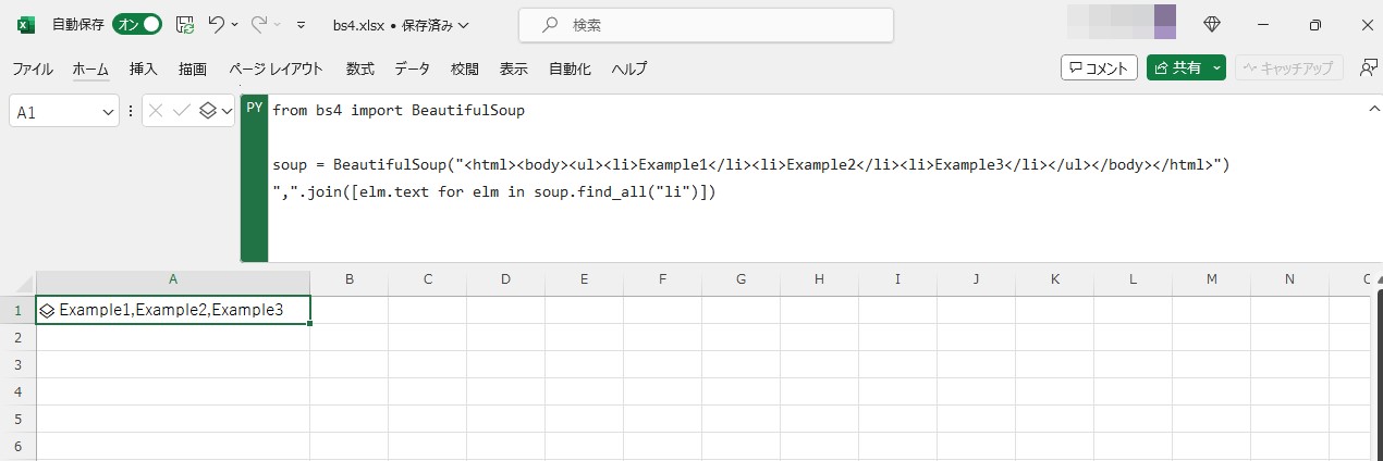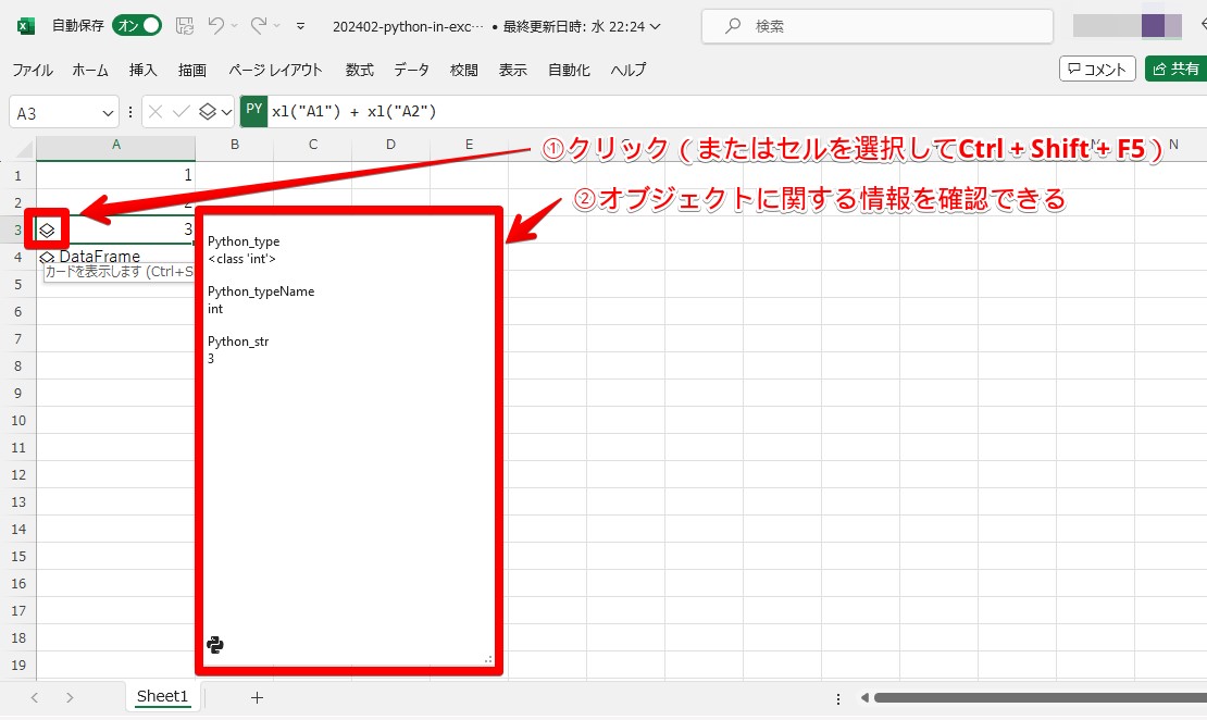 「Pythonオブジェクト」は、Pythonコードの実行結果をそのまま埋め込む出力形式です。 コードが長くなりそうな場合に、=PY()Excel関数を埋め込むセルを分ける用途で使います。