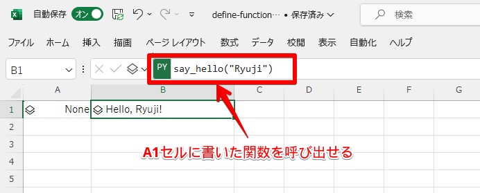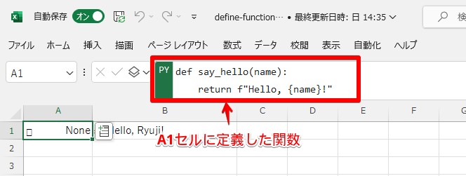 定義した関数はExcelブックの中で同一スコープになるので、A1セルのNoneという表示が気になる場合は関数定義用のシートを用意する方法もあります。
