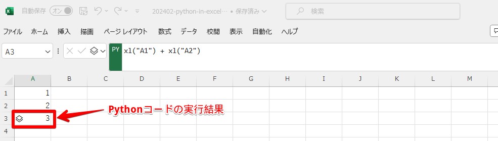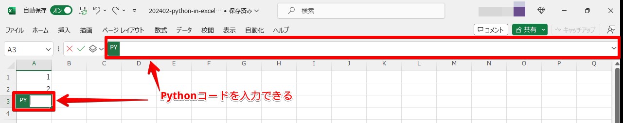 Python in Excelでは、=PY()というExcel関数にPythonコードを渡すことでPythonを実行し、結果をセルに埋め込むことができます。 A3セルに=PY(まで入力してください。 以下の部分にPythonコードを入力できるようになります。