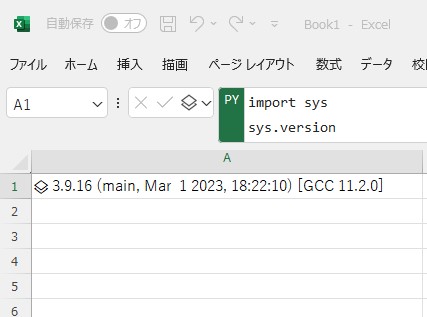 なお、Python in Excelで利用できるPythonのバージョンは、本記事執筆時点でPython 3.9.16です。sys.versionを実行すると確認できます。