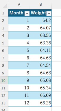 次に、dataシートにテーブルを挿入します。この手順はxl()関数でデータを参照する際に必要です。テーブルの挿入は画面上のメニュー[挿入]-[テーブル]をクリックするか、入力したデータのどこかのセルを選択してCtrl + Tで実行できます。