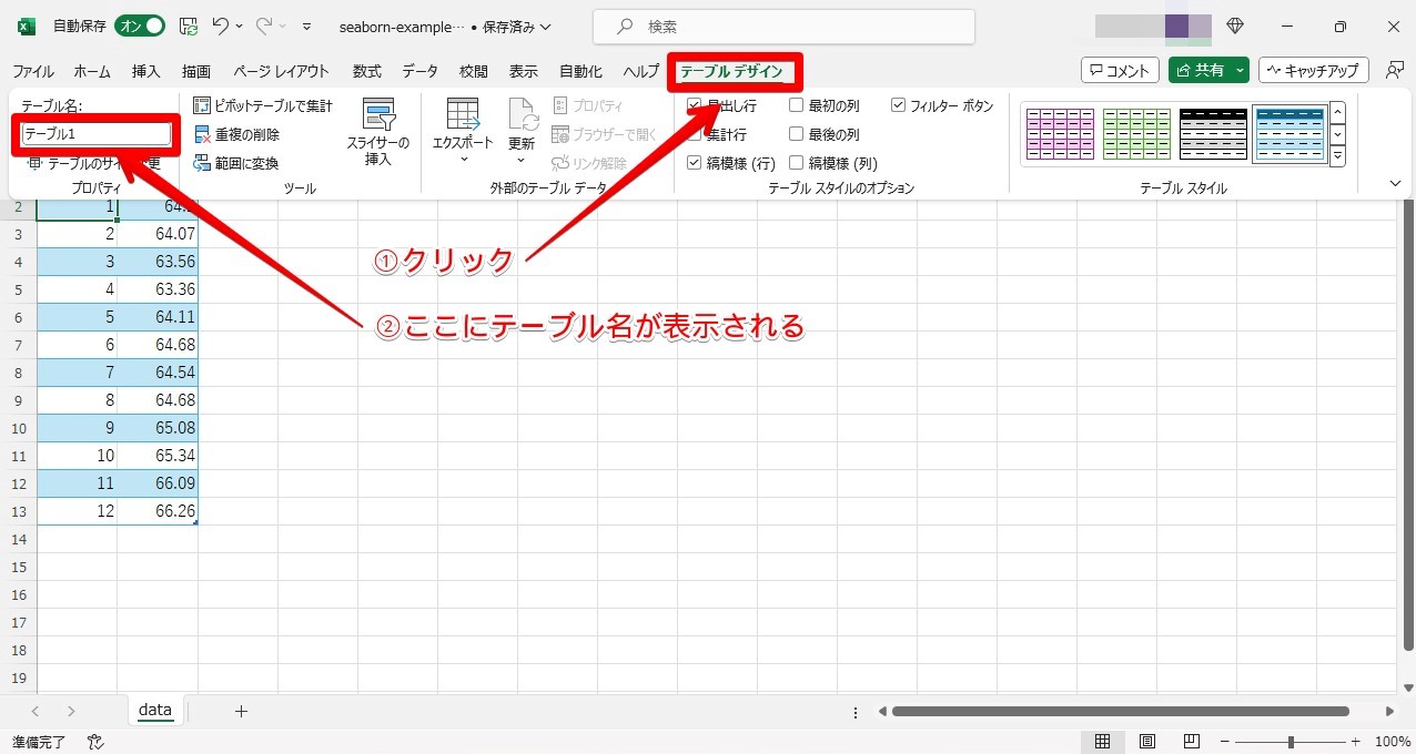 テーブル1というテーブル名は、テーブルのどこかを選択してからメニューの[テーブルデザイン]で確認できます。また、名前の変更もできます。