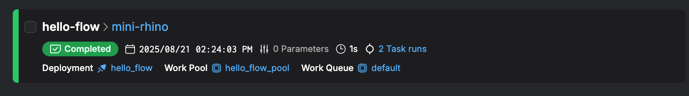 Work Pools がReady状態になったことで、ようやくフローを実行できる準備がすべて整いました。 試しにデプロイメント画面から「Run」ボタンで実行してみると、フローが実行されて完了したことを確認できます。 また、筆者の環境ではスケジュールされた時間でも自動的にタスクが実行されることを確認できました。